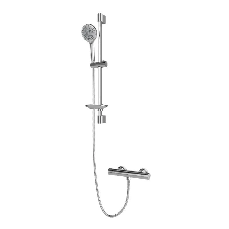 A premium single outlet, bar type mixer shower connected by stainless steel hose to an adjustable, round handset with 3 spray patterns that sits in a push button holder for variable height adjustment on a stainless steel rail. Thermostatic control gives the user assurance of safe and accurate temperature selection and cool touch technology also keeps the valve surface temperature safe in the event of any user contact. A forceful and refreshing shower experience is delivered from the single mode, rub clean handset that sits in a push button holder for variable height adjustment on a stainless steel rail. The quality all-chrome finish with 5 year parts and labour guarantee add even more value to this basic bar valve mixer shower which already delivers a temperature safety premium and is suitable for all approved UK high pressure water systems operating between 1-5 bar pressure